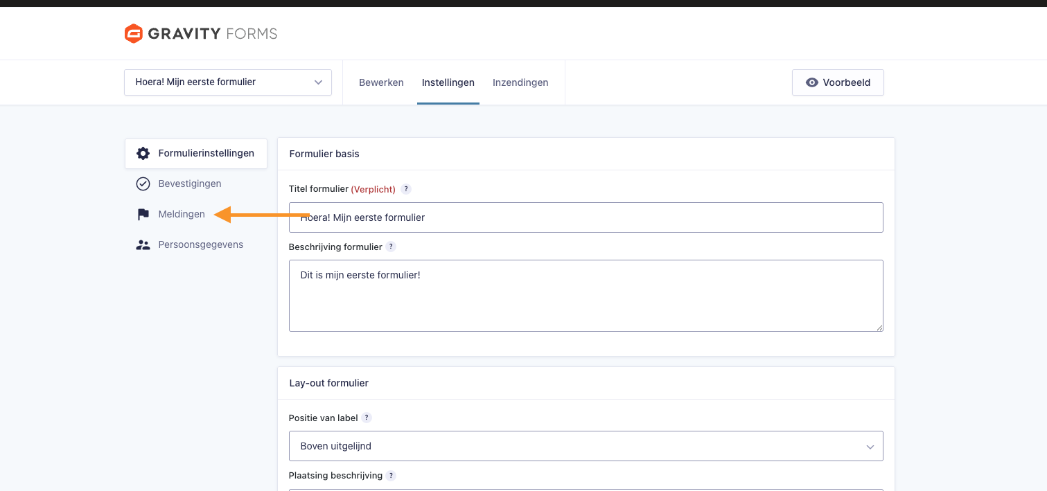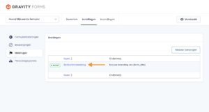 Klik in het instellingenmenu aan de linkerkant op ‘Meldingen’. Hier beheer je de e-mailnotificaties die worden verstuurd na een succesvolle formulierinzending.