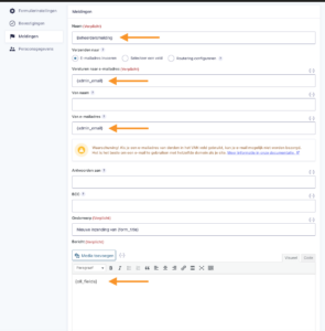 In dit scherm kun je de instellingen van de melding aanpassen. Controleer of de juiste gegevens zijn ingevuld, zoals de naam van de melding, het e-mailadres waar de melding naartoe wordt gestuurd en het afzender e-mailadres.