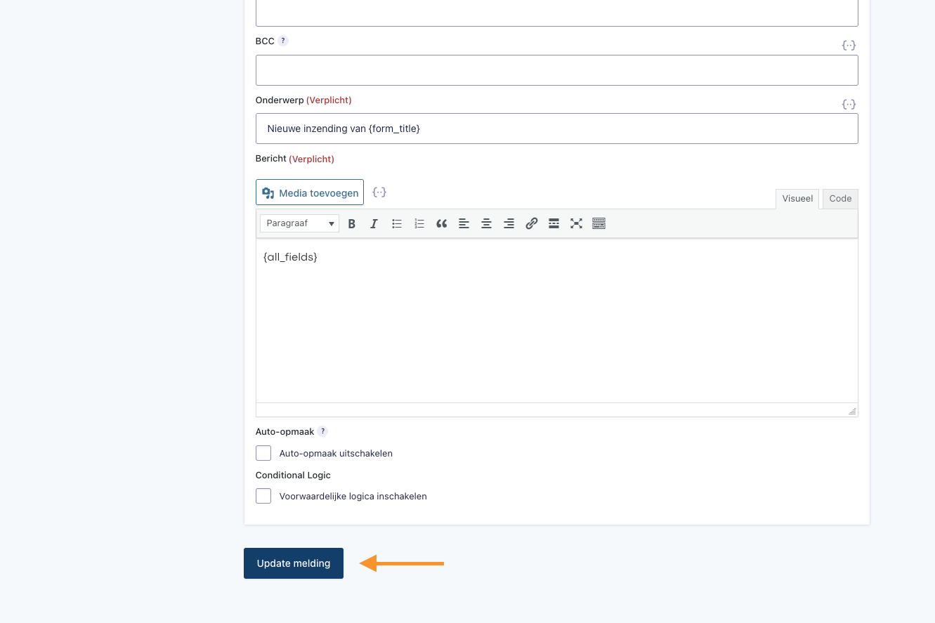 In het veld Bericht kun je bepalen welke informatie in de e-mail wordt meegestuurd. Met de merge tag {all_fields} worden automatisch alle ingevulde velden van het formulier in de e-mail weergegeven.