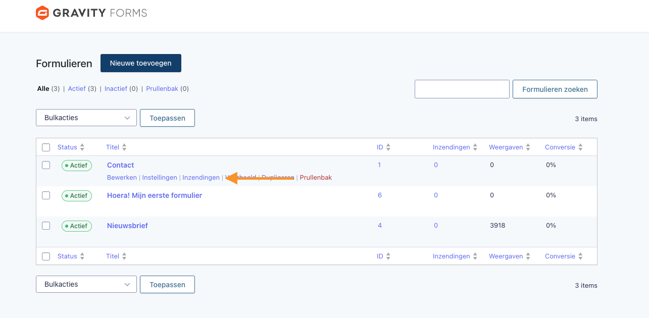 📌 Tip: In de kolom Inzendingen kun je ook direct zien hoeveel inzendingen een formulier al heeft ontvangen.