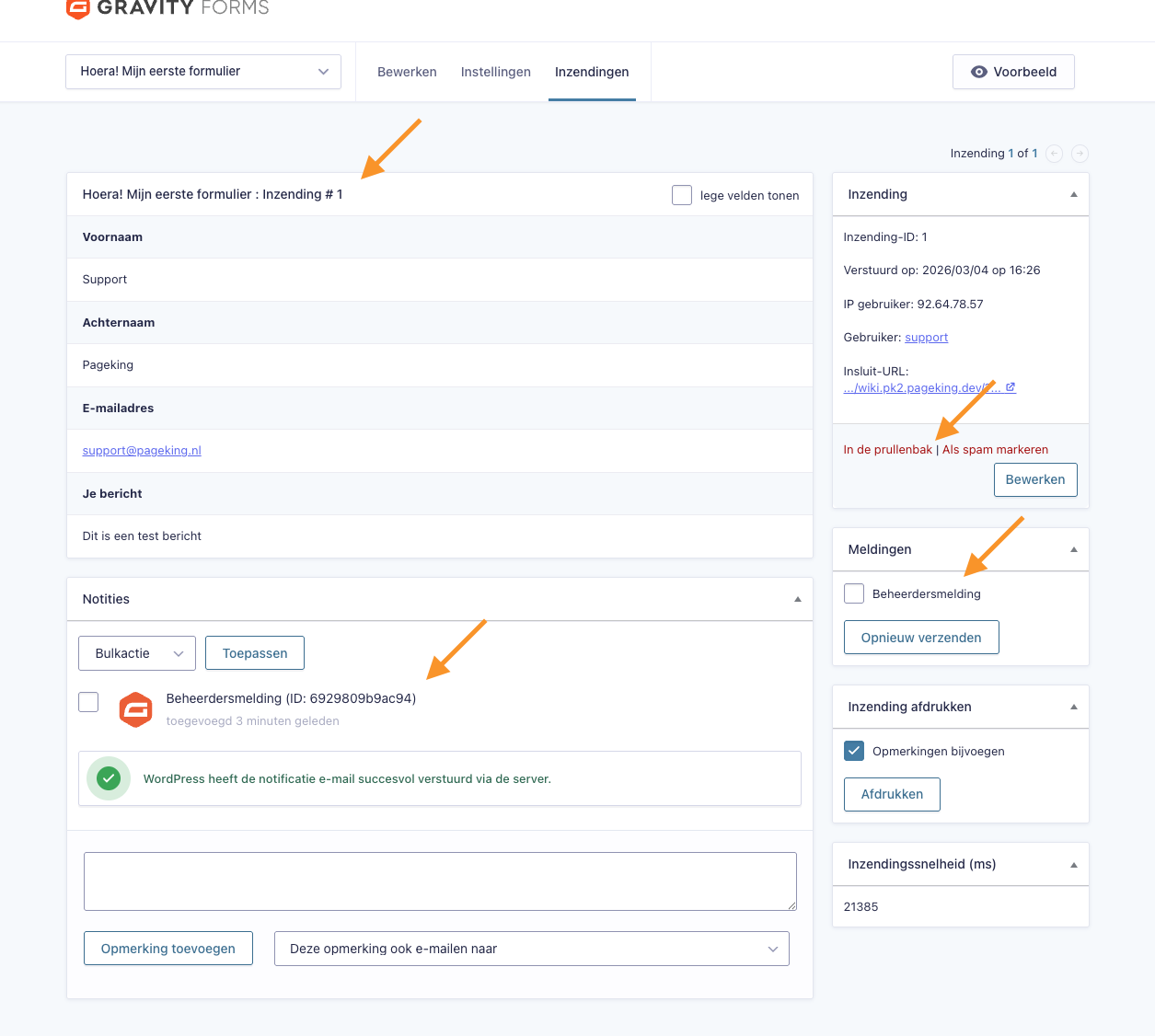 Aan de rechterkant vind je extra opties, zoals het bewerken van de inzending, het opnieuw verzenden van de notificatie en het markeren als spam of verwijderen van de inzending.